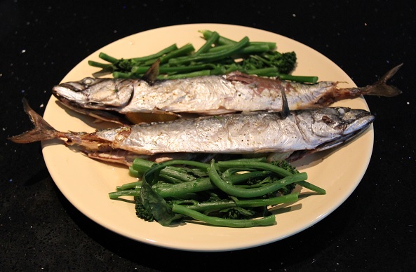 Having cleaned and prepared the fish (it’s OK, I made sure I cleaned up behind myself!), it was time to select a recipe. Unfortunately I couldn’t find anything that took my fancy so I decided to go free-form… Mackerel stuffed with crushed garlic, fresh ginger, lemon wedges and freshly ground pepper. Baked in a hot oven for about 20 mins. You might want to stuff yours with something else!