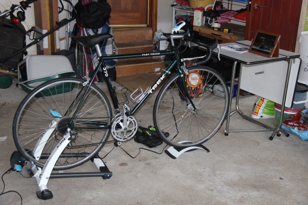 At the moment however I wouldn’t even be able to make it home if I headed out on a bike (our house is at the top of a hill). So today I started putting in the hours (well half an hour at least). Stationary. In the garage. Plodding (if it’s possible to plod on a bike!)